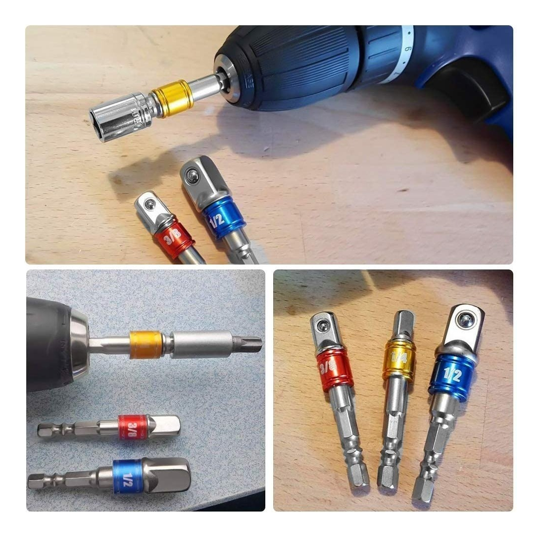 Medidas de los adaptadores:1/4 pulgada3/8 pulgada1/2 pulgadaCompatibilidad: Se puede usar con taladros y atornilladoras.Nota: El taladro no está incluido.
