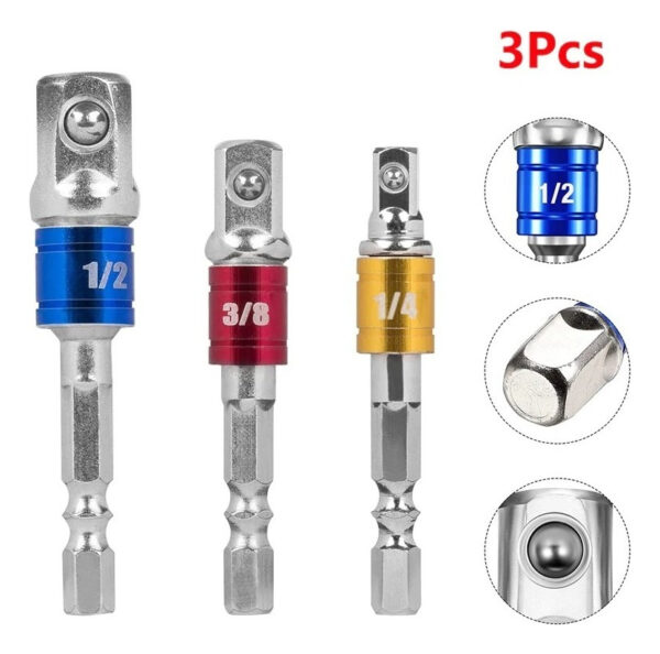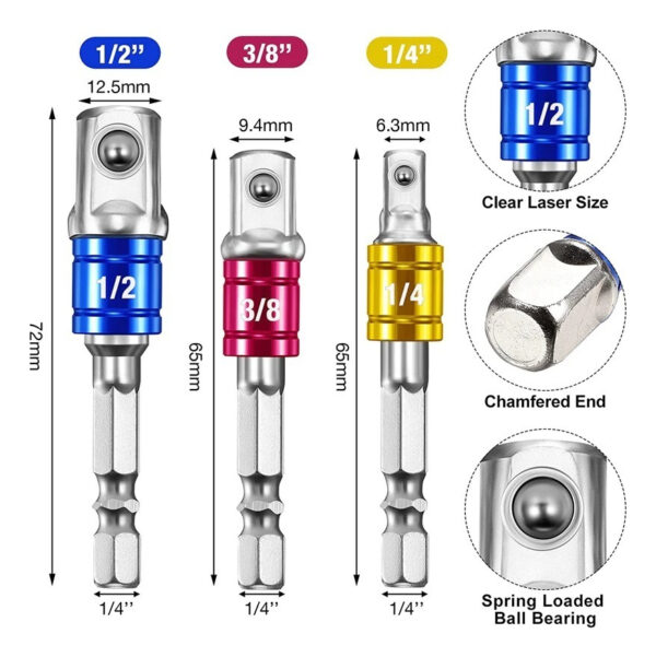Este set incluye tres adaptadores de dados de alta resistencia, ideales para convertir tu taladro en una herramienta versátil para uso con llaves de dados.