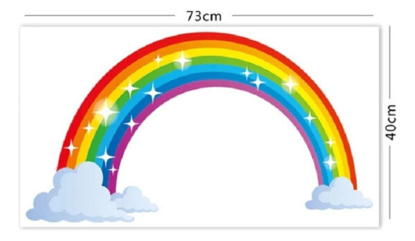 Tamaño Generoso: Mide 73 cm de largo x 40 cm de alto, ideal para crear un ambiente alegre y colorido.Fácil Instalación: Debido a su tamaño, el arcoíris se presenta en 3 partes, lo que facilita su colocación en la pared.Material de Calidad: Fabricado en PVC, asegurando durabilidad y un acabado atractivo.Uso:
