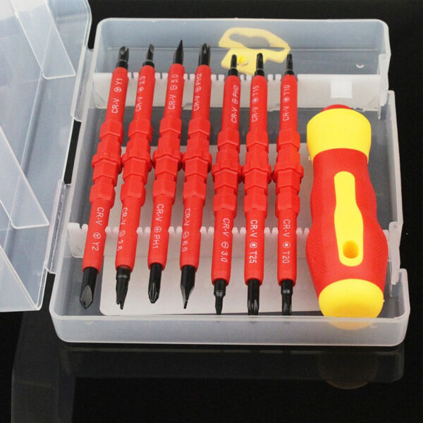 Juego de Destornilladores para Electricistas VDE – 8 Uds.Este juego de destornilladores es ideal para electricistas y profesionales que requieren herramientas seguras y eficientes. Todos los destornilladores están totalmente aislados, garantizando protección contra altas tensiones.