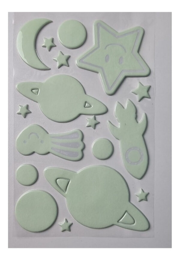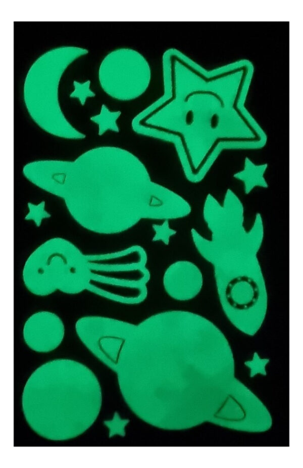 Material: Fabricados en PVC autoadhesivo de alta calidad, estos elementos decorativos son fáciles de aplicar y quitar sin dañar las superficies.Diseños Variados: El conjunto incluye un total de 17 unidades con diseños creativos como estrellitas, lunas, planetas, círculos y una nave espacial, aportando un toque lúdico y astronómico a cualquier habitación.Tamaños: Los diseños varían en tamaño desde 12 milímetros hasta 90 milímetros, permitiendo una gran versatilidad en la decoración y la posibilidad de crear composiciones únicas en las paredes.Efecto Fotoluminiscente: Brillan en la oscuridad después de haber estado expuestos a la luz, ofreciendo un efecto visual encantador por la noche.Aplicaciones: