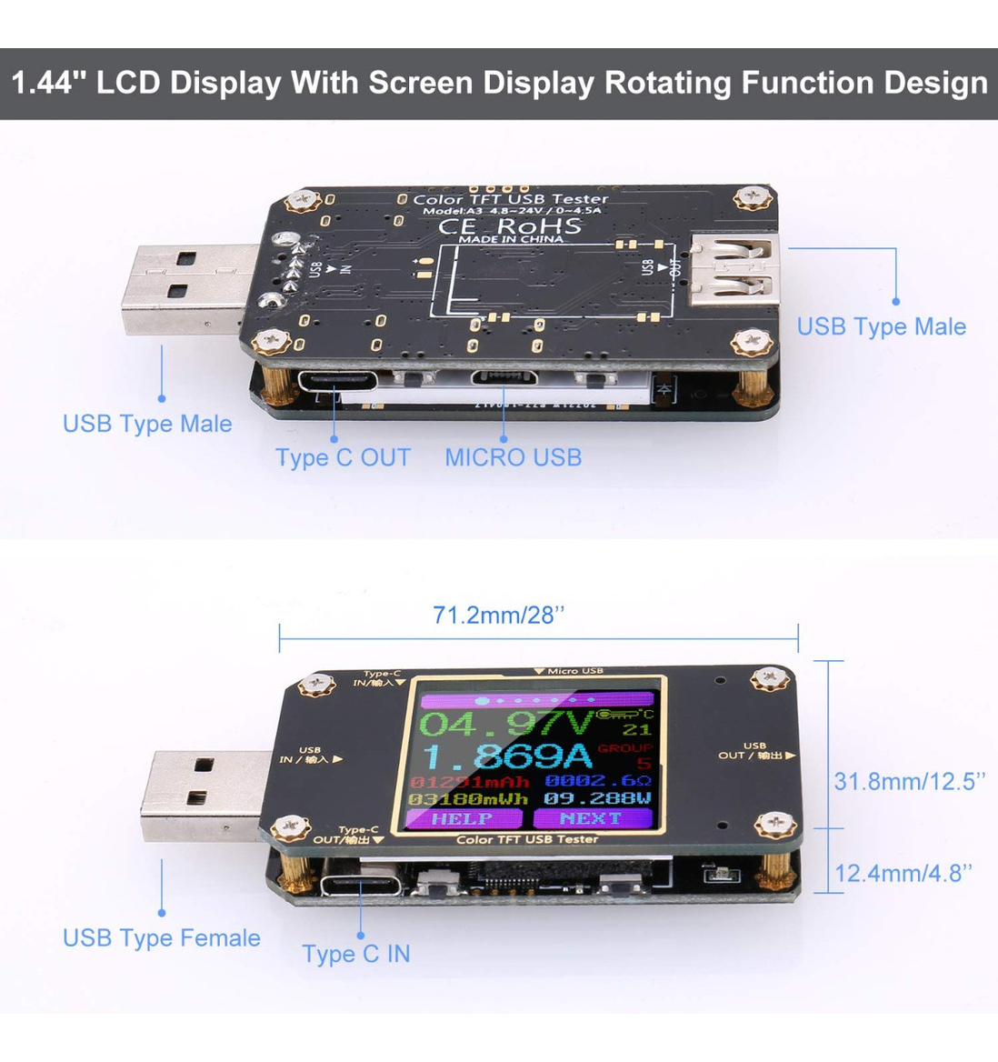 Reconocimiento rápido del cargador.Prueba de valor de resistencia del cable de datos.Soporta QC2.0/QC3.0 para detección de voltaje/corriente/energía.Almacenamiento de datos y medición de impedancia de cable.Este dispositivo te permite comprobar el rendimiento de carga de los cargadores de pared, de automóvil, paneles solares y cables de carga USB. Además, puede encontrar la corriente más alta de cargadores inalámbricos y probar la capacidad y energía eléctrica de bancos de energía.